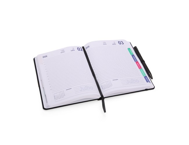 Descrição: Agenda diária 2026 com capa em linho com detalhe em metal, marca-páginas feito em cetim, porta-canetas lateral e fechamento em elástico. Possui páginas para planejamento mensal, calendários de 2026 a 2028, além de listas de conversão de pesos e medidas, contatos e códigos DDI.