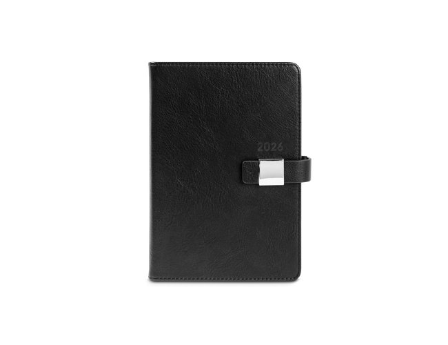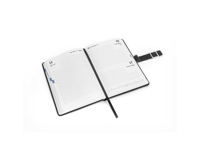 Agenda A5 em PU (58% reciclado), com fecho magnético e placa metálica. Possui um suporte para esferográfica (não inclusa) e um marcador em fita. Está organizada em plano diário (70 g/m²). 148 x 212 mm