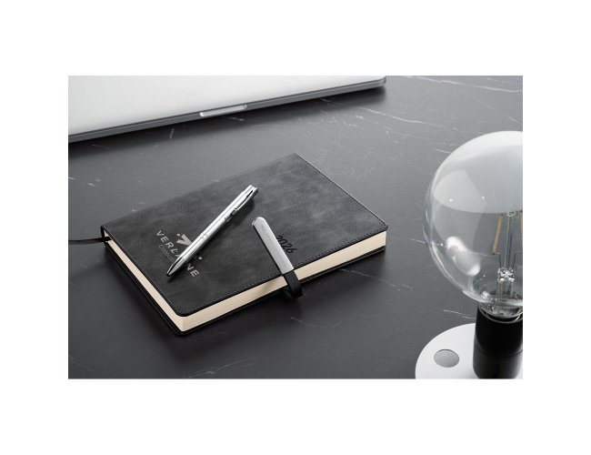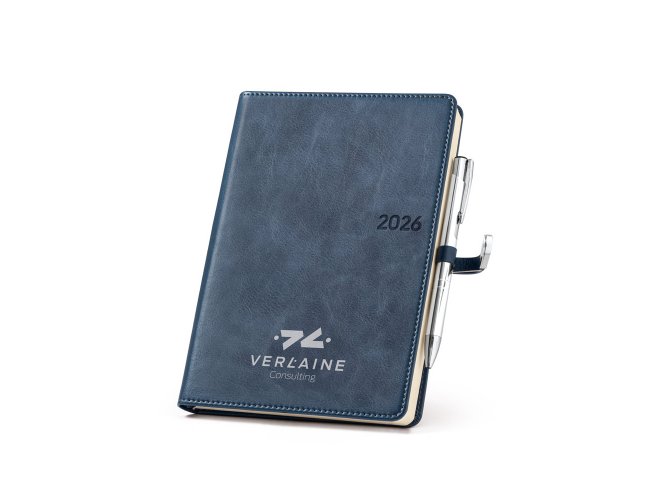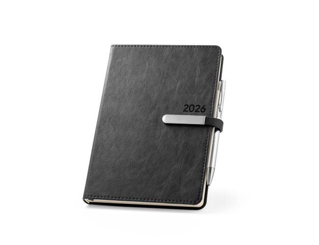 Agenda A5 em PU, com fecho magnético e peça metálica brilhante. Possui um suporte para esferográfica (inclusa) e marcador em fita. Está organizada num plano diário (70 g/m²). Fornecida com bolsa de non-woven. 148 x 210 mm | Bolsa: 205 x 250 mm
