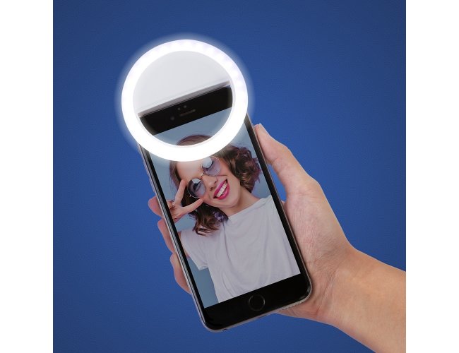 Anel de iluminação para celular, utilizado para fotos em formato selfie. ?Ring light? plástico no formato ?presilha? para encaixe, possui três estágios de iluminação acionados pelo botão superior. Acompanha cabo USB para carregamento.
