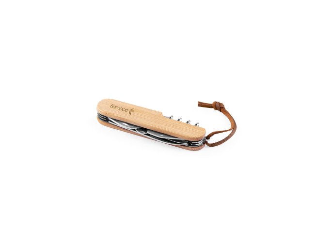 RYKER. Canivete multifunções em bambu e aço inox com cordão em PU com 7 funções