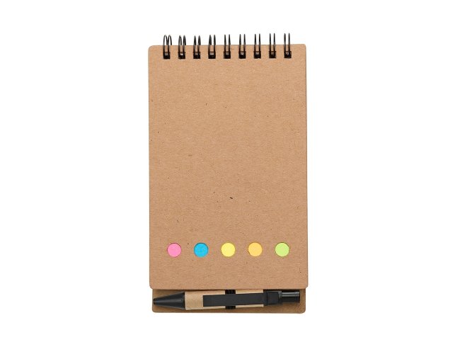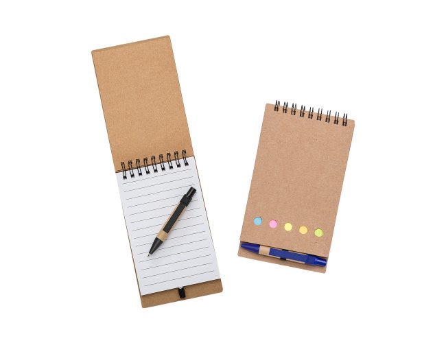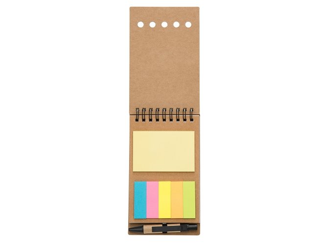 Bloco de anotações ecológico com autoadesivos e mini caneta. Bloco com wire-o e detalhes vazados na capa, contém conjunto de cinco bloquinhos autoadesivos coloridos, bloco autoadesivo pequeno, miolo com folhas pautadas e suporte de nylon com mini caneta de papelão com carga esferográfica na cor azul e acionamento por clique..