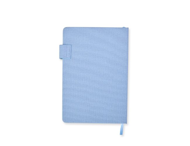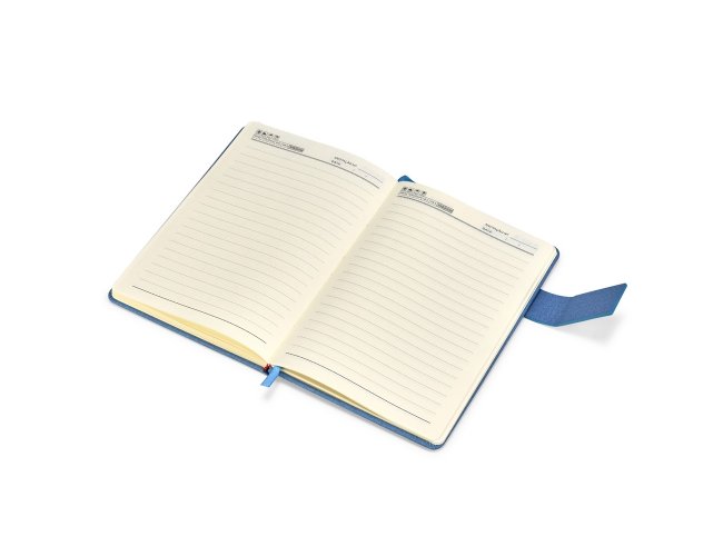 Caderneta capa dura em couro sintético com fecho magnético, placa metálica personalizável, além de marca-página em fita de cetim e aproximadamente 96 folhas brancas pautadas.