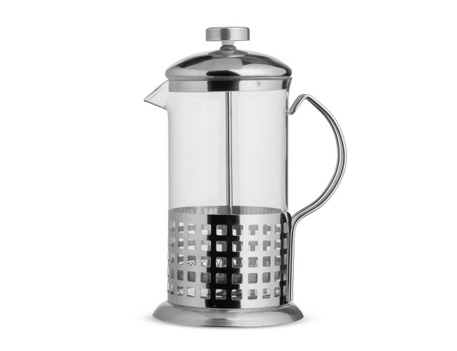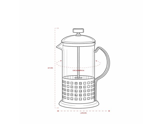 Cafeteira tipo prensa francesa com capacidade para até 600ml. Feita em vidro com detalhes e alça em inox, além de tampa com êmbolo e tela em inox.