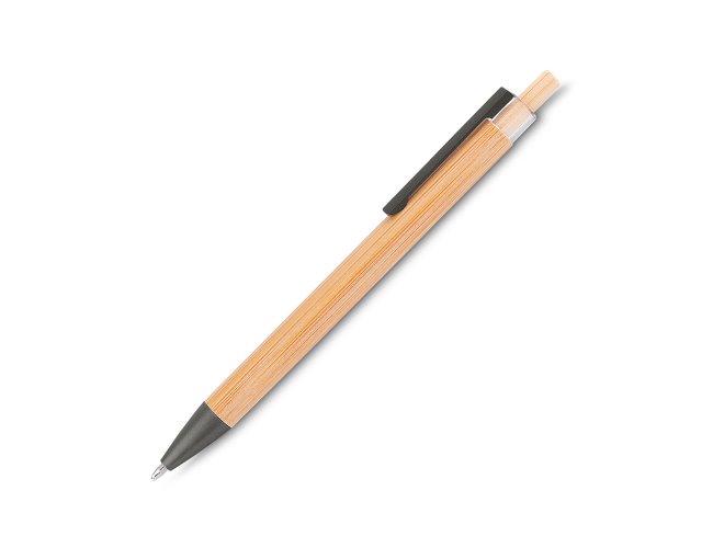 Caneta com corpo e acionador em bambu, detalhe em plástico no acionador, ponteira e clipe cinza fosco