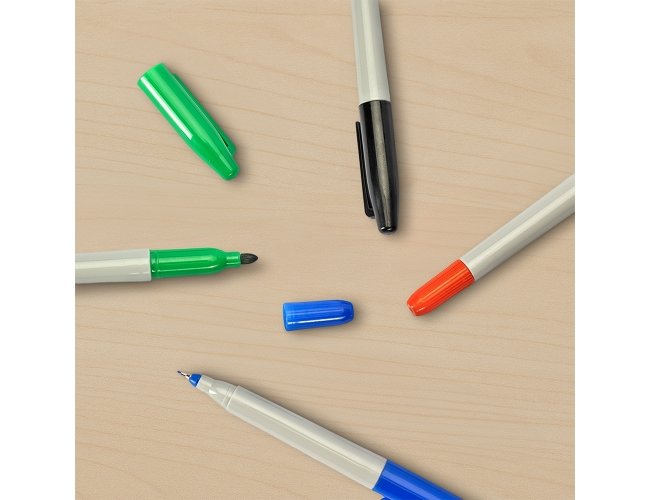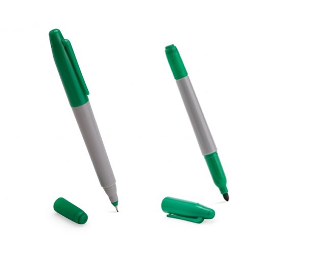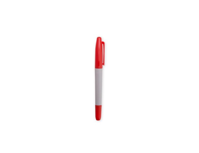 Caneta marcadora plástica com duas pontas em formatos diferentes: uma fina e outra tipo pincel. Possui tinta atóxica à base de óleo com solvente alcoólico.