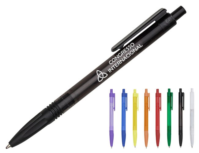 Descrição: Caneta plástica com carga esferográfica azul 1.0 mm e acionamento por clique.