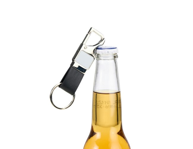 Chaveiro em metal com tira em couro sintético. Possui mosquetão e pode ser utilizado como um abridor de garrafas.