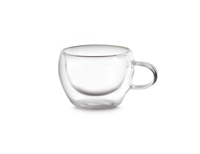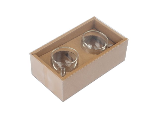 Conjunto com 2 xícaras de vidro borossilicato com parede dupla e capacidade de até 60ml.