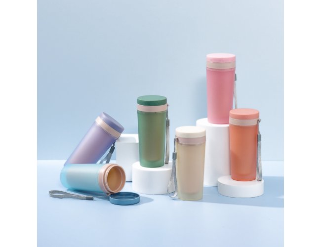 Copo de plástico polipropileno com capacidade para 350ml livre BPA, parede dupla. Acompanha tampa rosqueável e alça de nylon para transporte.