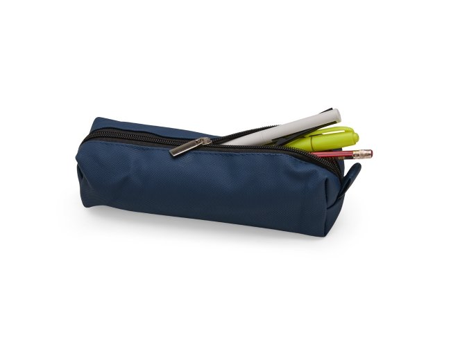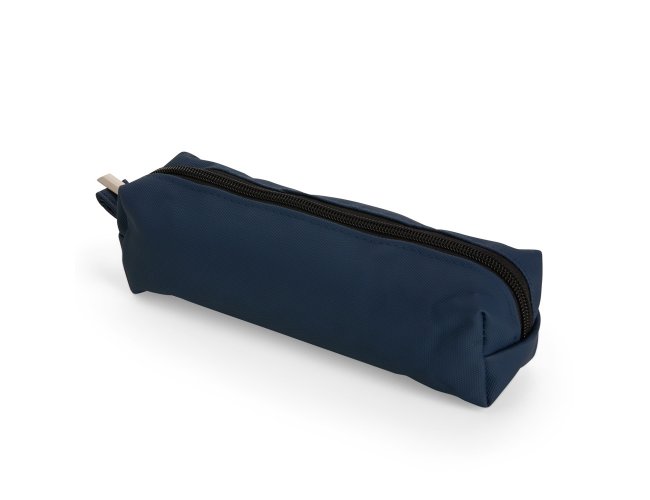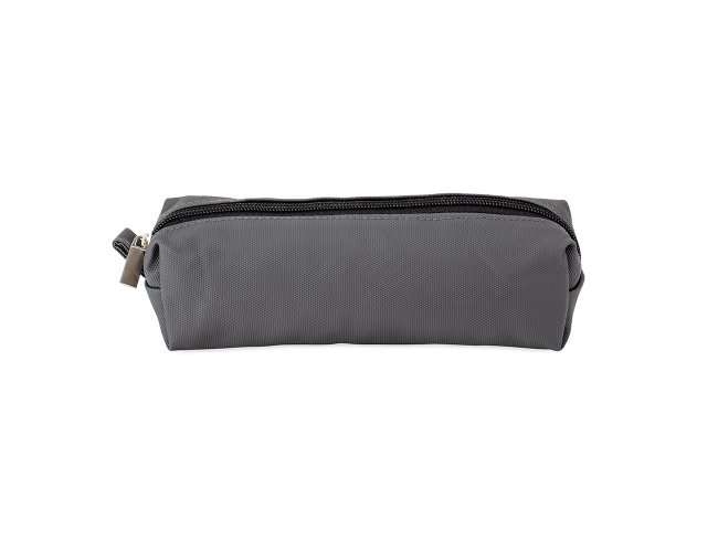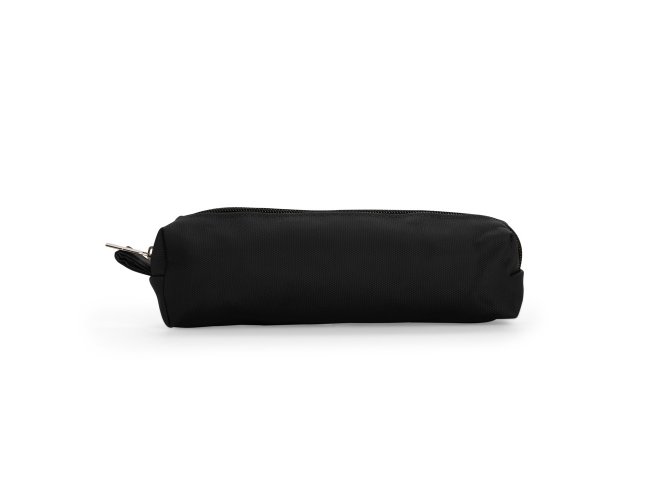 Estojo confeccionado em couro sintético com fechamento em zíper e uma pequena alça para fixação em chaveiro ou gancho.