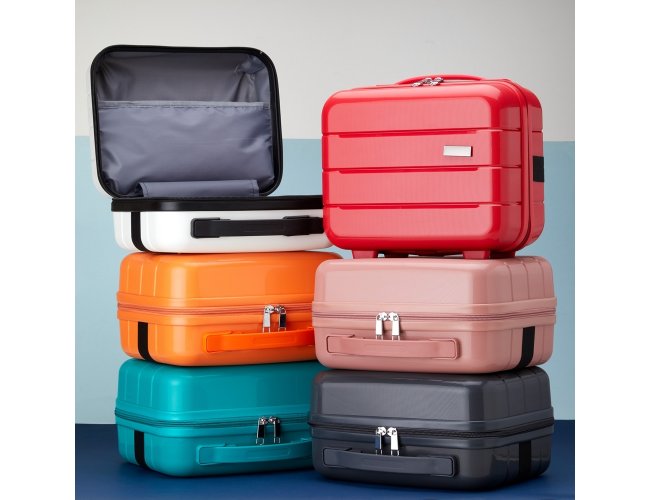 Frasqueira de plástico (casca dura). Possui compartimento interno, elástico de segurança, alça para encaixe em malas de viagem e 4 apoios para maior estabilidade. Acompanha placa de personalização.