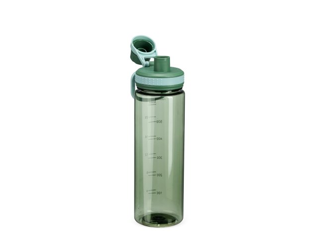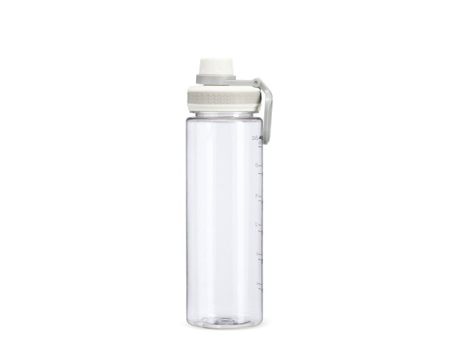 Garrafa plástica com capacidade máxima de 750ml e marcação impressa de volume de até 700ml. Possui tampa rosqueável com protetor para o bocal e alça para transporte.
