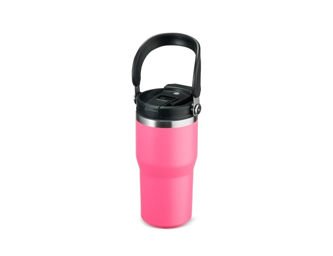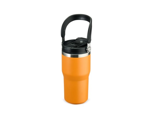 Copo térmico em inox com pintura eletrostática e capacidade máxima de 600ml. Conta com estrutura de parede dupla e vedação a vácuo que permite a conservação da temperatura de líquidos por mais tempo. Possui tampa plástica rosqueável com protetor para o bocal, bico flip, canudo interno removível e alça fixa para transporte.