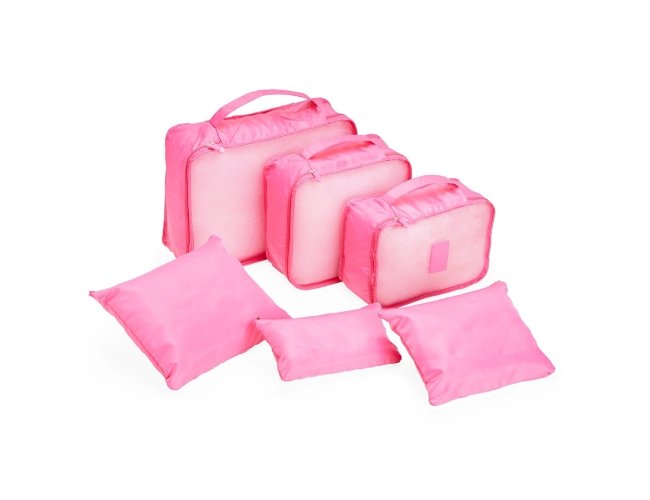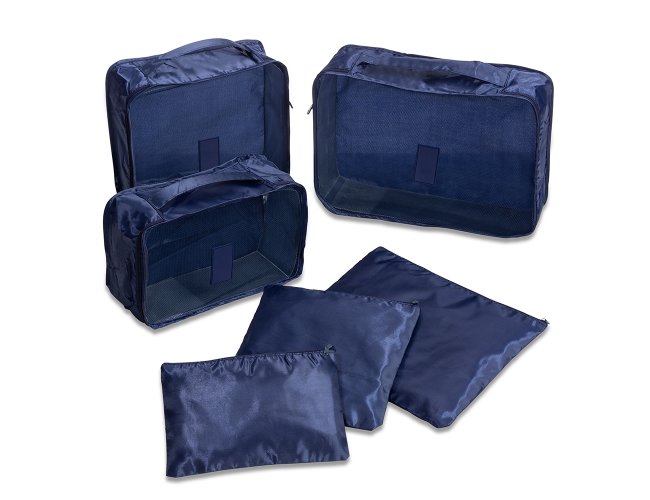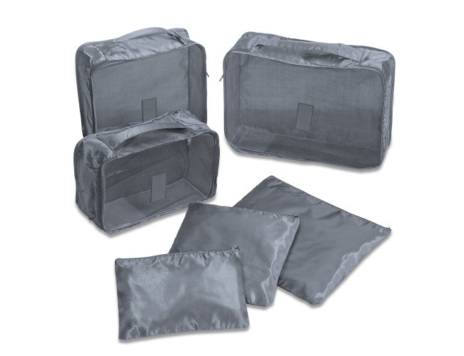 Kit necessaire com 6 peças confeccionadas em nylon. O cojunto de necessaires possui tamanhos diferenciados, sendo 3 unidades com: alça para transporte, zíperes com pegadores emborrachados, parte frontal com malha de nylon e plaquinha emborrachada para personalização; possui também 3 unidades de necessaires em nylon inteiramente lisas e impermeáveis.