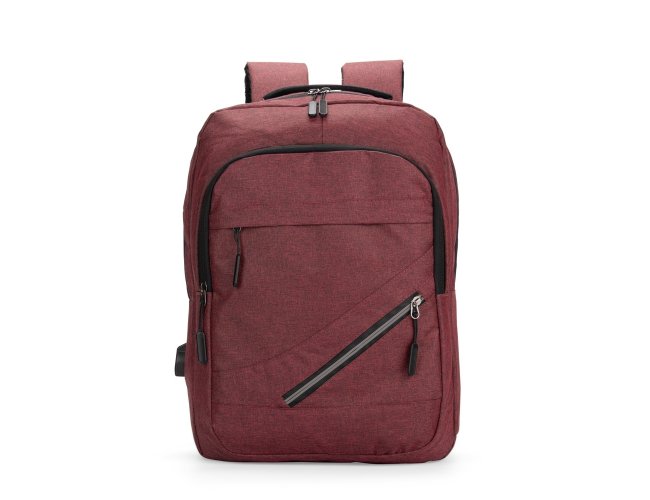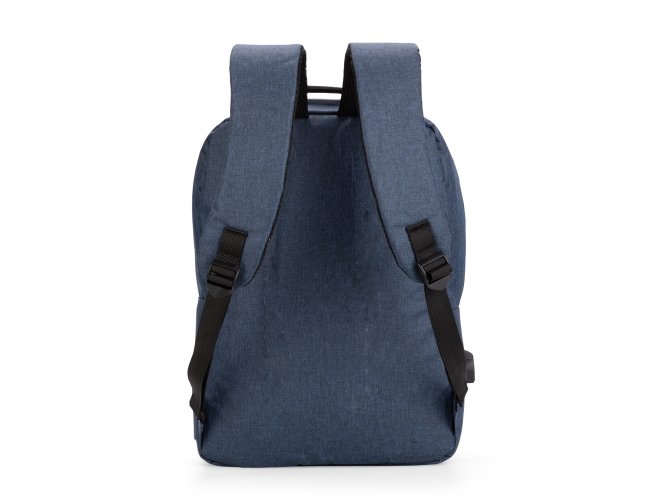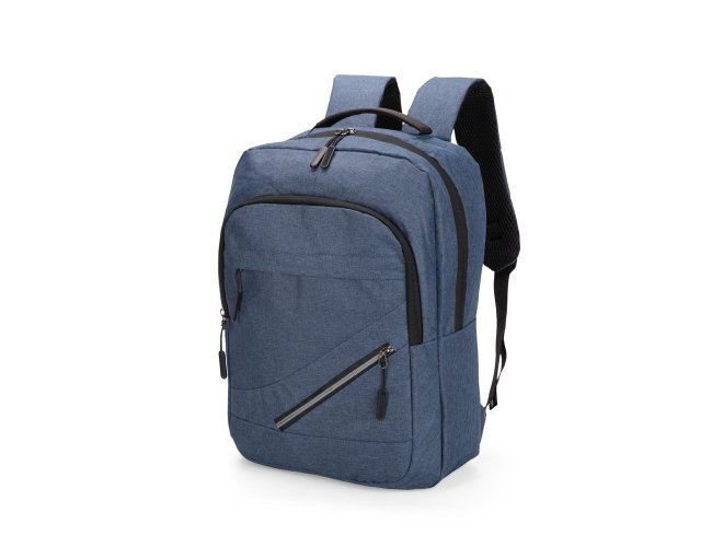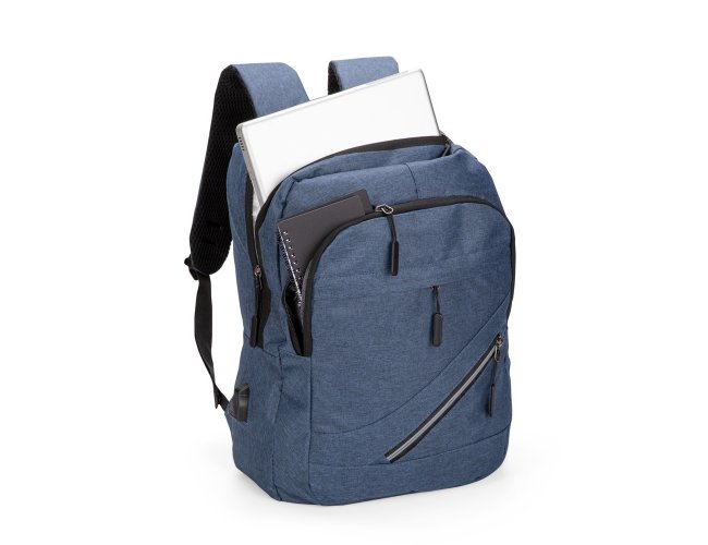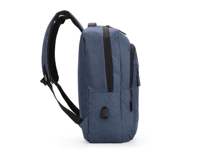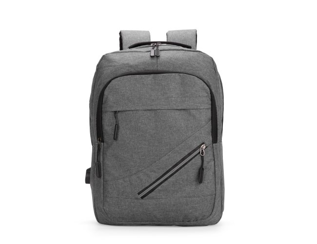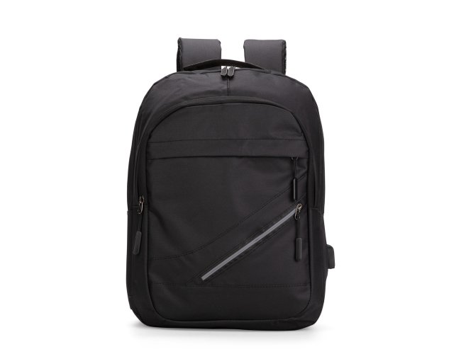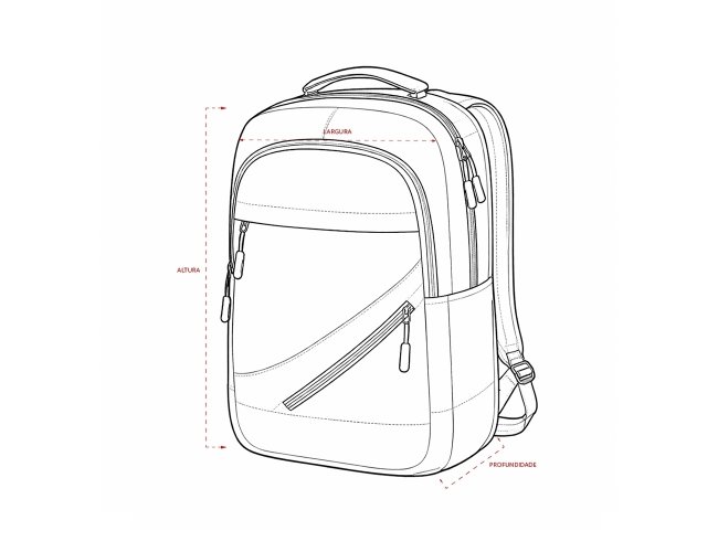 Mochila em tecido Oxford resistente à água com capacidade máxima de 18 litros. Possui compartimento principal com quatro bolsos pequenos e divisória acolchoada para notebook de até 15,6 polegadas. Apresenta um compartimento frontal e dois bolsos em tamanhos diferentes, um deles com faixa refletiva na área do zíper, além de um bolso e um adaptador USB posicionados em laterais opostas. Dispõe de alça superior de mão e duas alças de ombro, estas com revestimento em tecido respirável. Obs.: A posição do adaptador USB pode variar conforme o lote do produto.