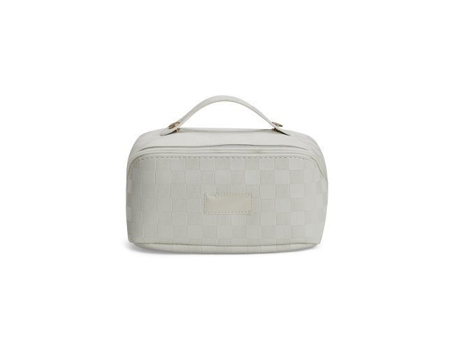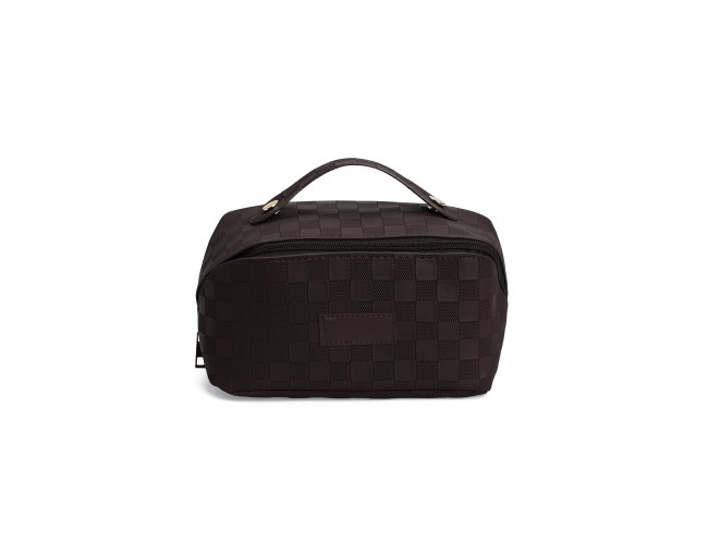 Nécessaire com zíper e couro sintético. Possui abertura larga, 3 bolsos, 3 compartimentos para organização dos itens, alça superior e área de personalização em couro sintético.