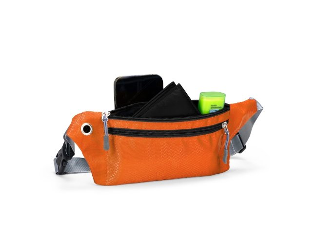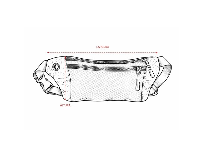 Pochete esportiva confeccionada em poliéster filamentado resistente à água. Possui cinto ajustável com fivela plástica de encaixe, saída para fones de ouvido e três compartimentos com fechamento em zíper, sendo dois na parte frontal e um traseiro antifurto.