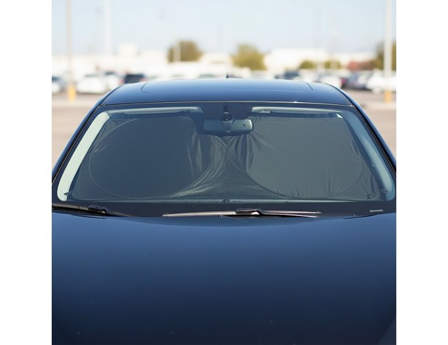 Descrição: Protetor solar dobrável para para-brisa, confeccionado em tecido leve e com estrutura flexível. Possui alça lateral elástica para facilitar o manuseio.