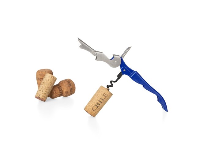 Descrição: Saca-rolhas metálico de 2 estágios com acabamento fosco. Contém abridor de garrafa, lâmina de corte e saca-rolhas.